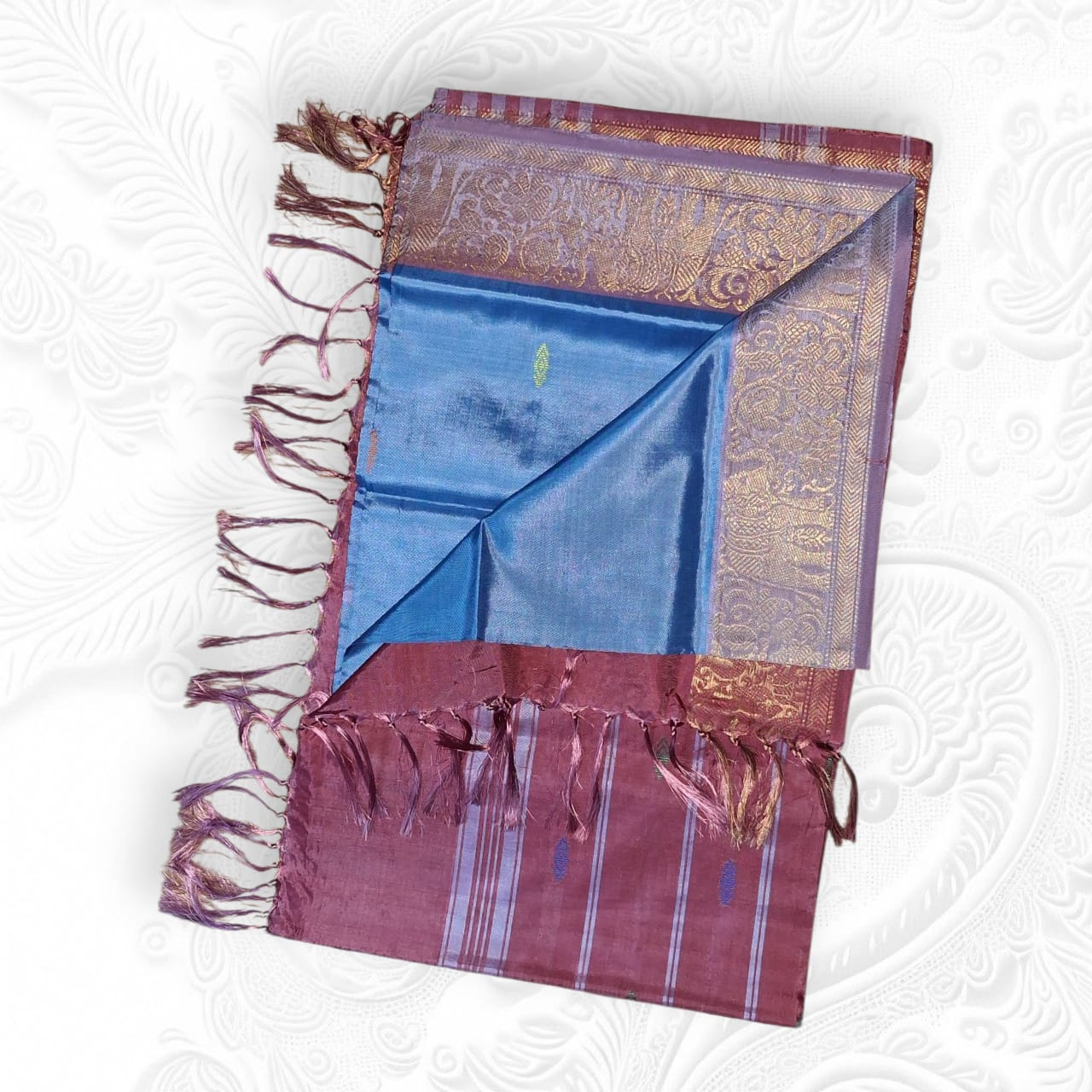 Elegant Blue Body with Maroon Pallu – Contrast shades for a grand festive look.