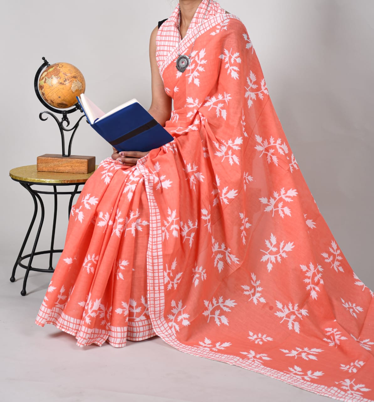 Add a refreshing charm to your ethnic wardrobe with this Peach Printed Cotton Saree adorned with white floral motifs and a stylish checked border. The subtle yet lively design blends tradition with contemporary appeal, making it versatile for both work and leisure.