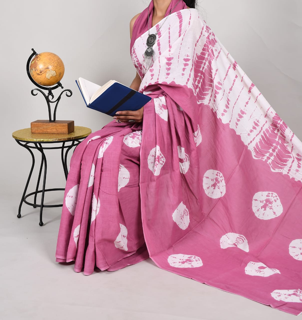Pink & White Tie-dye Printed Cotton Saree – Lightweight & Casual Wear